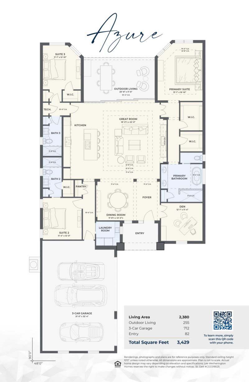 The Azure floor plan is part of Wild Blue at Waterside, a new home community by Lee Wetherington Homes, located in Lakewood Ranch, FL. Visit the Wild Blue at Waterside community page for full neighborhood insights, including nearby schools, shopping, walk & bike-scores, commuting, air quality & natural hazards.