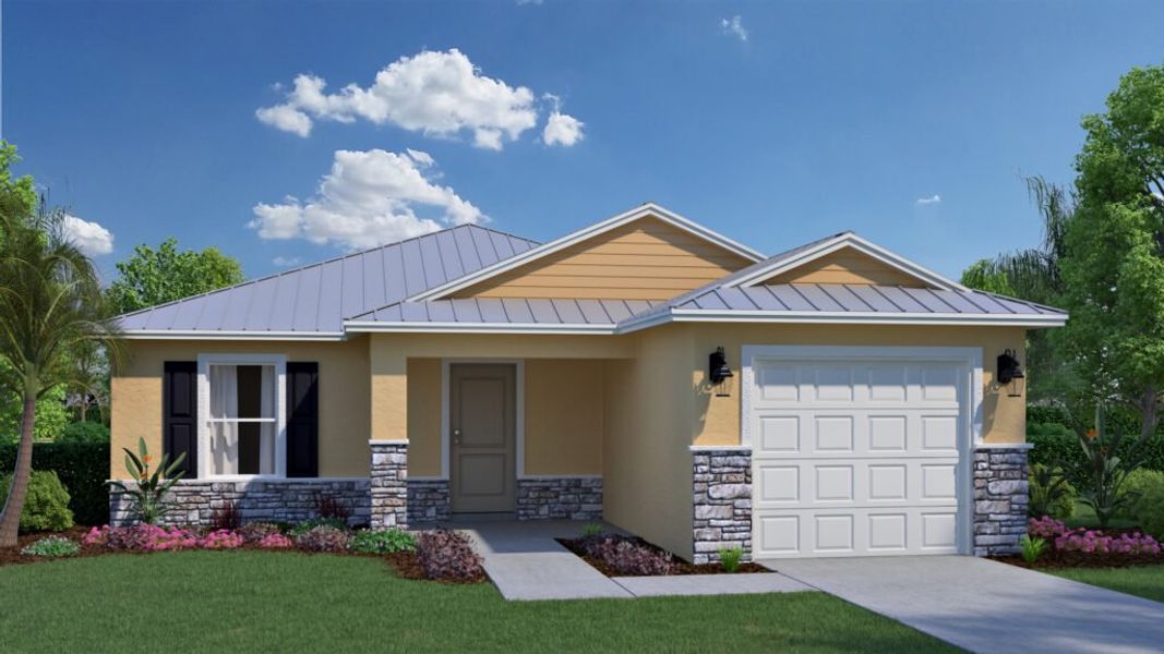 The Horizon is a bright and inviting home designed for comfort, simplicity, and effortless Florida living. With 1,135 square feet of well-planned space, this two-bedroom layout is ideal for those who want a cozy low-maintenance home while still enjoying the amenities and lifestyle of Spanish Lakes. A covered entry leads you into a welcoming foyer that opens directly into the spacious great room. This open living area is the heart of the home, offering plenty of room for relaxing, hosting friends, or enjoying a quiet morning with the sun coming through the windows. The great room flows into a thoughtfully designed kitchen that features an island, generous counter space, a pantry, and a comfortable layout that keeps everything within easy reach. The owners suite is located toward the back of the home and offers a peaceful retreat with a walk-in closet and a private bathroom. Bedroom 2 sits near the front, providing a perfect space for overnight guests, a craft room, or a home office. A second full bathroom is conveniently located with easy access from either the guest bedroom or the hallway. Step outside to the covered outdoor living area, where you can enjoy warm breezes, morning coffee, or an evening chat with neighbors. It extends your living space and makes it easy to enjoy the Florida lifestyle year-round. Everyday convenience is built in with a designated laundry room, a linen closet, and a one-car garage. The Horizon also features coastal-inspired exterior styles with metal roofs and impact glass windows, offering both beauty and peace of mind. The Horizon is a wonderful choice for homebuyers who want a comfortable home inside a lively 55+ community filled with activities, friendships, and fun.