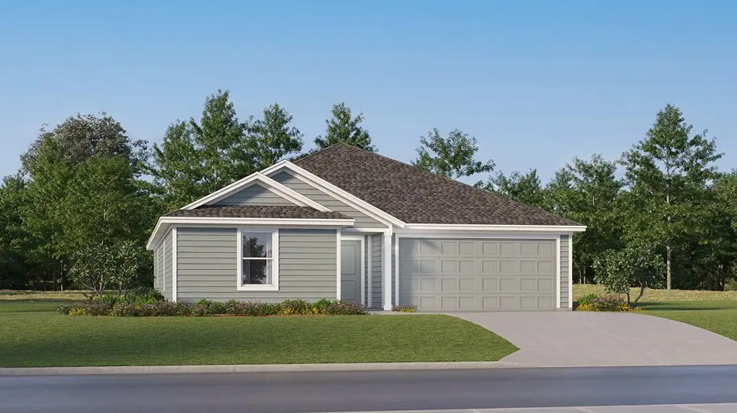 This new four-bedroom home offers convenient single-story living. Upon entry are three secondary bedrooms steps from a full bathroom, leading to an open plan shared between the kitchen, living and dining areas. Tucked away to the side of the home is a versatile flex space, ideal as a studio or office. A luxurious owner’s suite provides a private retreat at the back of the home, complete with a full bathroom and walk-in closet.