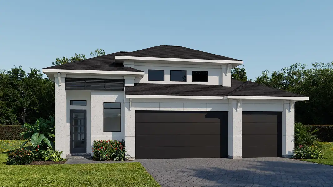 The side entryway off the front porch is lined with windows to let in ample natural light. The kitchen greets you with an island with built-in seating and a corner walk-in pantry. The dining area sets the space for the open concept family room that is embraced by a wall of windows. The backyard features a covered lanai. The primary bedroom is at the rear of the home and has three large windows overlooking the backyard. Double doors open into the primary bathroom which has dual vanities, garden tub, glass enclosed shower, and two walk-in closets. Three secondary bedrooms each with walk-in closets and two full bathrooms complete the space. The laundry room and drop zone are off the three-car garage.