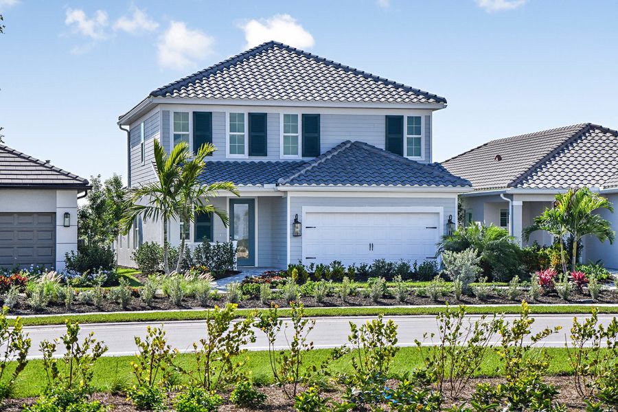 The Heritage is a 2-story, 4 bedroom, 2.5 bath single-family home featuring 2,428 sq.ft. of living space. The first floor holds a beautifully-equipped kitchen and over-sized walk-in pantry, offering plenty of space for culinary creativity. The oversized island and café area are the perfect setting to enjoy your meals or catch up with friends over coffee. The great room features sliding doors, where you can enjoy the view of your lanai in or outdoors. The master bedroom is located on the first floor, with dual sink vanities, a walk-in closet and corner shower.