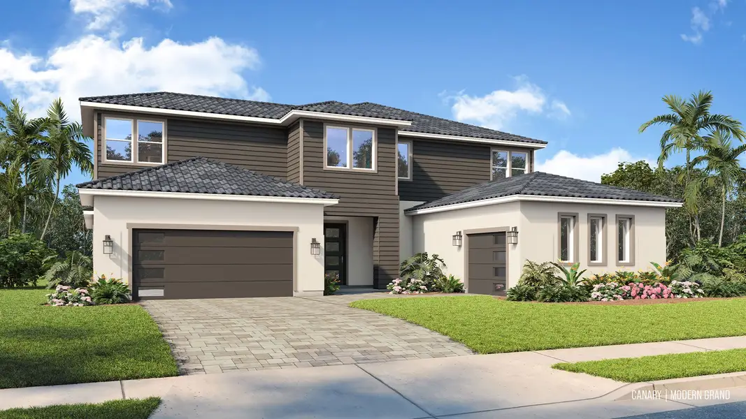 Gorgeous 2 Level Home with 3 Car Garage, up to 7 Bedrooms and up to 5,243 Sq. Ft. The Canary floor plan is available in Coastal or Modern exterior designs. Upon entry you are welcomed to a gracious foyer that leads to the expansive family room with access to an outdoor lanai. The well-appointed kitchen features a large walk-in pantry and generous island that overlooks the adjoining dining area. The primary suite boasts 2 separate walk-in closets and a spacious en suite bathroom with separate vanities, private water closet, step-in shower, and the choice to add a soaking tub between the vanities. A dining room, flex room, secondary bedroom, and laundry room complete the 1st floor. The 2nd floor offers a generous bonus room with access to the balcony, 2 secondary bedrooms and full bathroom with the choice of adding a 2nd full bathroom.