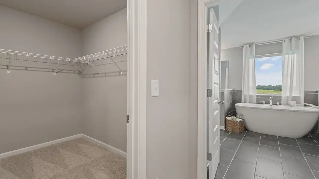 Luxurious Primary Suite: A peaceful retreat with sitting room, his and hers walk-in closets, a private en-suite bathroom with 2 separate vanities, linen closet, tub and walk-in shower.