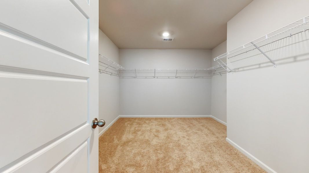 Luxurious Primary Suite: A peaceful retreat with an expansive walk-in closet, dual vanity, linen closet, tub and walk-in shower.