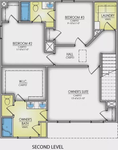 Main level features an open floor plan with a large great room, dining room open to kitchen with large island and pantry. A home office and powder room highlight the first level. Second level features a primary suit with a large walk-in closet, bathroom with double vanities, stand up shower, and private water closet. Two additional bedrooms with shared bath on this level.