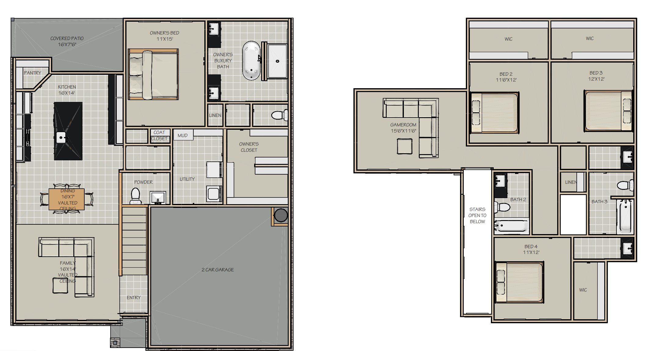 The The Sousness is a beautiful 2-story floor plan with 4 spacious bedrooms, and 3.5 modern bathrooms spread over 2,332 square feet. This plan also includes a garage with 2 spaces for parking vehicles, extra storage, or hobby essentials.