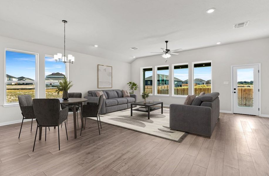 In the Crockett, a one-story single-family home, enjoy an expansive kitchen that opens up directly to the family room, creating the perfect area for entertaining family and friends. This home boasts plenty of room for guests to gather and enjoy.