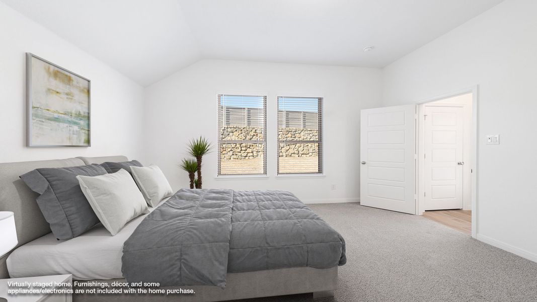 Entry leads to open kitchen, dining area and family room. Abundant natural light and 10-foot ceilings throughout. Kitchen features large walk-in pantry and generous island with built-in seating space. Family room features wall of windows. Primary suite includes bedroom with 10-foot ceiling. Double doors lead to primary bath with dual vanity, separate glass-enclosed shower and large walk-in closet. Secondary bedrooms feature walk-in closets. Covered backyard patio. Utility room leads to two-car garage.