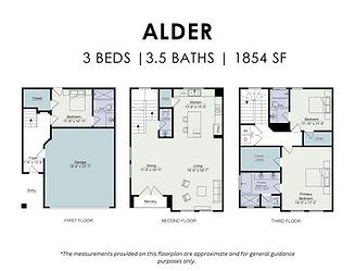The Alder is a beautiful 3-story floor plan with 3 spacious bedrooms, and 3.5 modern bathrooms spread over 1,854 square feet. This plan also includes a garage with 2 spaces for parking vehicles, extra storage, or hobby essentials.