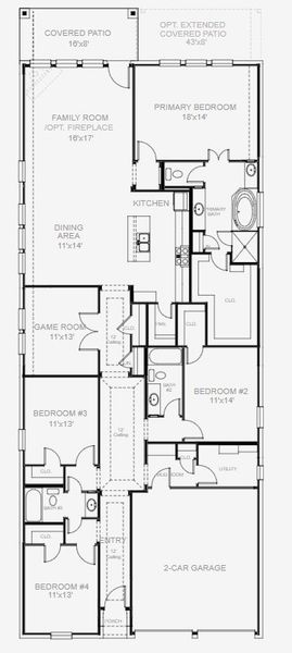 Coffered extended entry leads past game room to open kitchen, dining area and family room. Kitchen features deep walk-in pantry and generous island with built-in seating space. Dining area features curved wall of windows. Family room features wall of windows. Primary suite includes bedroom with wall of windows. Double doors lead to primary bath with dual vanity, garden tub, separate glass-enclosed shower and oversized walk-in closet. Abundant closet space and large windows add to this spacious four-bedroom design. Covered backyard patio. Mud room off two-car garage.