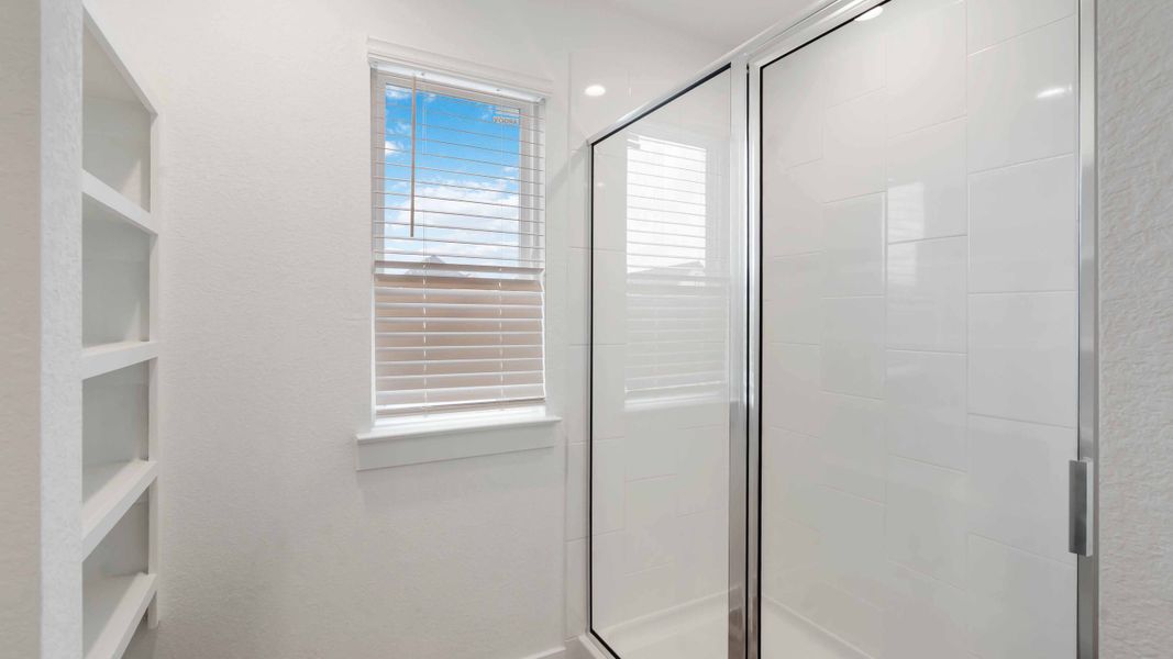 Upstairs, the Iris floor plan provides ample living space with a spacious game room, ideal for family fun or additional entertainment. To the left of the game room is the primary bedroom, featuring two large windows that allow plenty of natural light. The attached primary bathroom includes a dual-sink vanity and a standing shower, offering both style and functionality. A generous walk-in closet is conveniently located just off the primary bathroom for extra storage space.