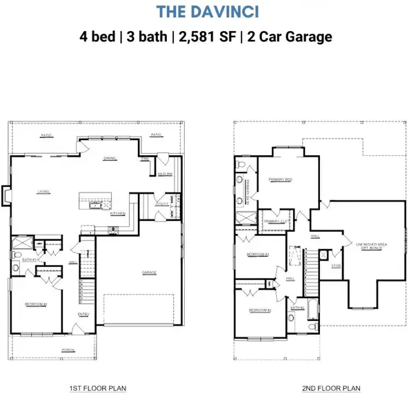 The The Da Vinci is a beautiful 2-story floor plan with 4 spacious bedrooms, and 3 modern bathrooms spread over 2,581 square feet. This plan also includes a garage with 2 spaces for parking vehicles, extra storage, or hobby essentials.