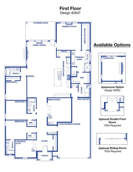 The Grand Falls is a beautiful 1-story floor plan with 4 spacious bedrooms, and 4 modern bathrooms spread over 2,847 square feet. This plan also includes a garage with 3 spaces for parking vehicles, extra storage, or hobby essentials.