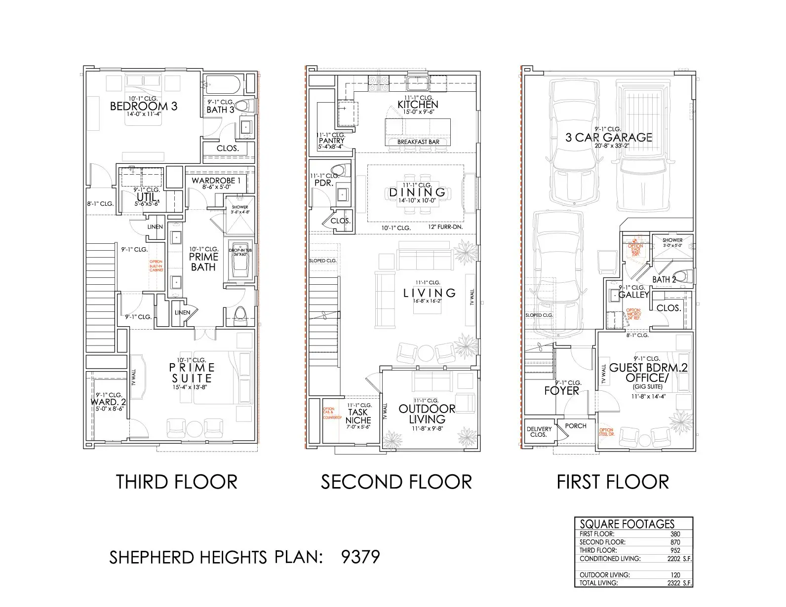 The 9379 is a beautiful 3-story floor plan with 3 spacious bedrooms, and 3 modern bathrooms spread over 2,322 square feet. This plan also includes a garage with 3 spaces for parking vehicles, extra storage, or hobby essentials.