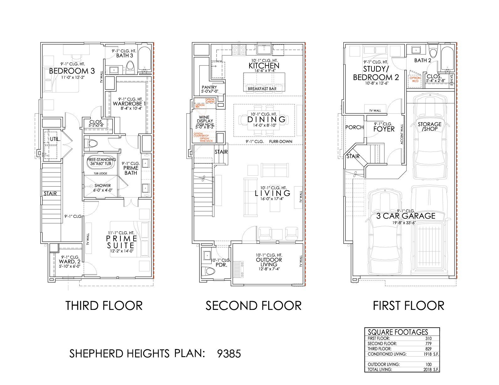 The 9385 is a beautiful 3-story floor plan with 3 spacious bedrooms, and 3 modern bathrooms spread over 2,018 square feet. This plan also includes a garage with 3 spaces for parking vehicles, extra storage, or hobby essentials.