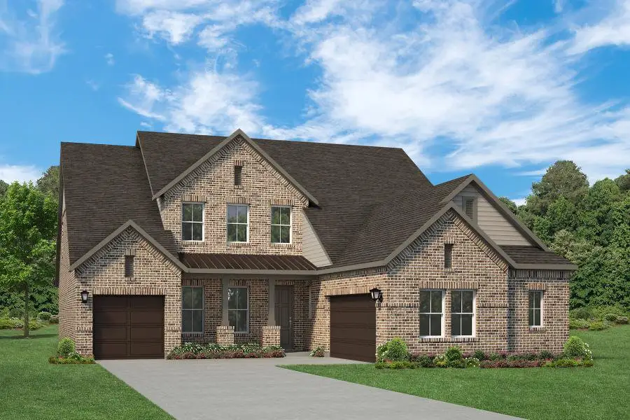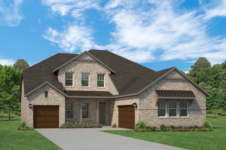 The Louis new home design by RockWell Homes is located on over-sized 60-foot-wide home site offers a blend of elegance and practicality, featuring 4 to 5 bedrooms, 3.5 to 4.5 bathrooms, a home office, gameroom, and an optional media room, complemented by a spacious 3-car garage. The stunning exterior boasts a combination of brick and stone, metal accent roofs, an 8-foot front door, a covered porch, wood garage doors, and a covered backyard patio, setting an impressive tone. Inside, the foyer with soaring ceilings and an open staircase with metal stair-railing leads to a versatile home office and a private guest suite on the first floor. The open concept living and kitchen area is designed as the heart of the home, featuring a large center island with bar top seating, abundant luxury solid surface countertops, GE stainless steel appliances, including a gas cooktop, built-in oven, microwave, and dishwasher. Additional kitchen highlights include 42-inch cabinets, upgraded cabinet options with custom wood vent hood, upgraded flooring, an undermount sink, butler's pantry cabinets, a large walk-in pantry, a Delta faucet, and recessed can lighting. The living area, enhanced by multiple dual-pane energy-efficient windows, soaring vaulted ceilings, includes an optional glass sliding door that opens to the covered patio and provides views of the private backyard. The private primary suite, strategically located at the back of the home, offers dual vanity sinks with luxury solid surface countertops, a freestanding garden tub, a ceramic tile shower with a semi-frameless glass enclosure, ceramic tile flooring, Delta faucets, a linen closet, private water closet, linen closet and a large walk-in closet. Guest suite located on the first floor features full bathroom with ceramic tile flooring, ceramic tile tub/shower surround, Delta faucets, luxury countertops, lighting package and towel bars. Upstairs, the home features an oversized gameroom, secondary bedrooms with a Jack and Jill bathroom, and options for a media room, a fifth bedroom, and an additional bathroom. Additional features of the Louis new home plan include a powder bathroom, fully automated sprinkler system, fully fenced private backyard with gate and metal posts, full gutters, smart home, tankless hot water heater, ceiling fans, over-sized utility area with ceramic tile flooring, dual-pane energy-efficient windows, energy-efficient HVAC, full landscaping package, garage door openers, covered patio, ample storage areas, ensuring both style and functionality throughout.