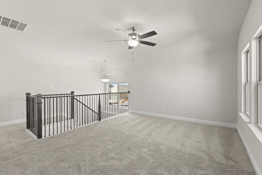 The primary suite features a window seat and a spacious bath with garden tub, separate tile shower with seat, quartz vanities, and a large walk-in closet. Upstairs, a large game room, three additional bedrooms with walk-in closets, a full bath, and extra storage room complete this thoughtfully designed home.