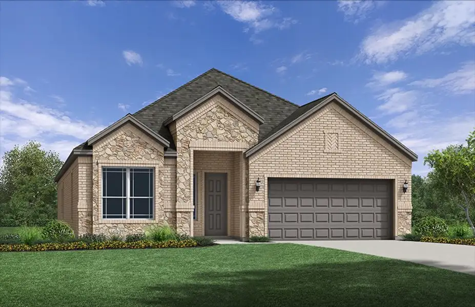 The Glen Rose is a beautifully designed one-story home offering 2,110 square feet of thoughtfully planned living space. The exterior showcases a timeless blend of brick and natural stone with buff mortar, highlighted by a welcoming brick front porch and classic architectural detailing.