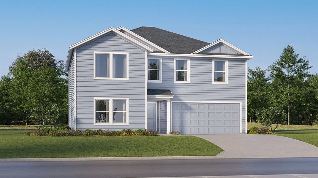 This new two-story home features a secluded bedroom off the foyer, just steps from a full bathroom, and a nearby open-concept layout encourages simple transitions and multitasking between the kitchen, living and dining areas. On the second floor, the luxe owner’s suite sweeps across the back of the home, complete with a full bathroom and walk-in closet, near two additional bedrooms and a versatile game room.