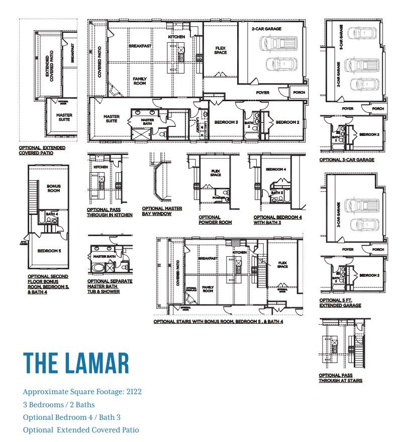 - Bay WindowsExtra Floor OptionSeparate Shower and TubBonus RoomExtended GarageGarage BayExtra BathroomExtra BedroomExtended Patio