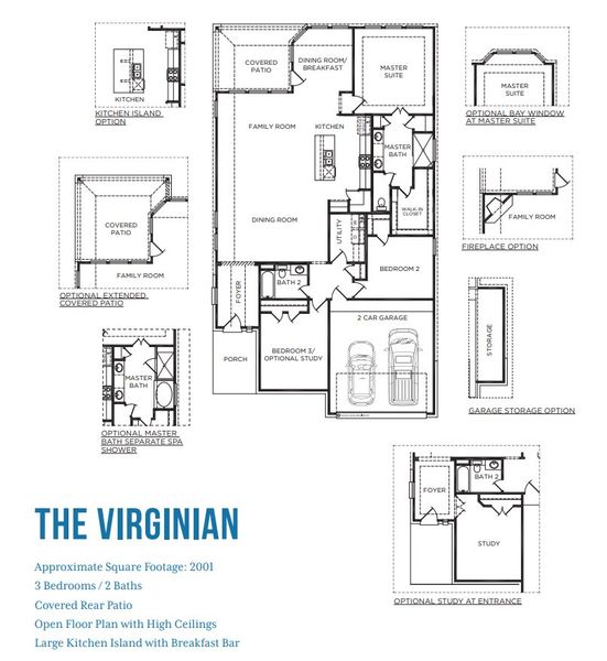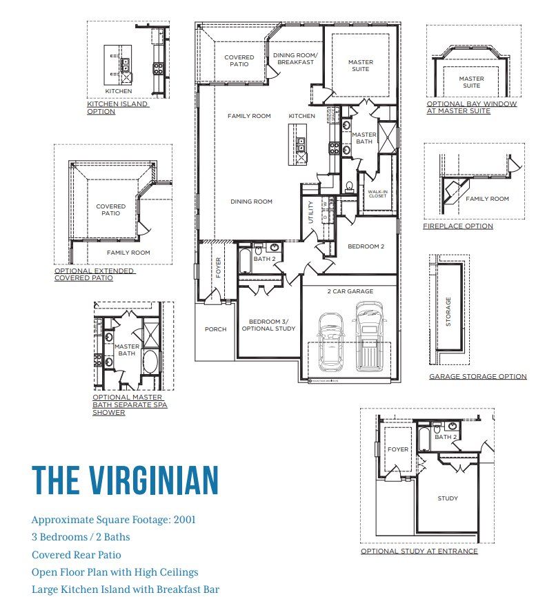 The The Virginian is a beautiful 1-story floor plan with 3 spacious bedrooms, and 2 modern bathrooms spread over 2,001 square feet. This plan also includes a garage with 2 spaces for parking vehicles, extra storage, or hobby essentials.