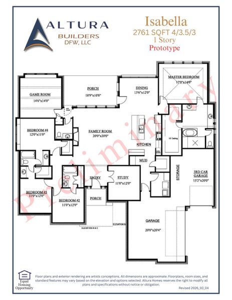The Isabella is a beautiful 1-story floor plan with 4 spacious bedrooms, and 3.5 modern bathrooms spread over 2,761 square feet. This plan also includes a garage with 3 spaces for parking vehicles, extra storage, or hobby essentials.