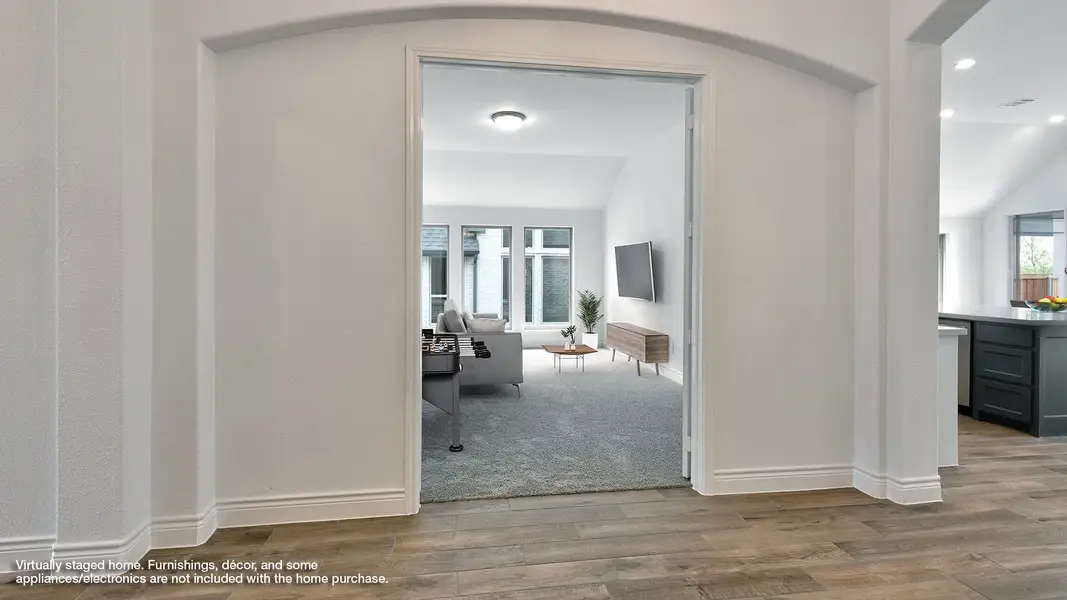 Entry welcomes with 12-foot ceiling. Game room off extended entry with 13-foot coffered ceiling. Spacious family room with wall of windows opens to kitchen and dining area. Kitchen offers corner walk-in pantry and inviting island with built-in seating space. Primary suite includes bedroom with wall of windows. Double doors lead to primary bath with dual vanities, garden tub, separate glass-enclosed shower and large walk-in closet. A guest suite with private bath adds to this four-bedroom design. Covered backyard patio. Two-car garage.