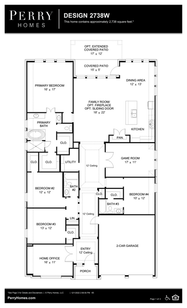 Home office with French doors set at entry with 12-foot ceiling. Game room with French doors off coffered extended entry. Spacious family room with wall of windows opens to kitchen and dining area. Kitchen hosts inviting island with built-in seating space. Primary suite includes bedroom with wall of windows. Dual vanities, corner garden tub, separate glass-enclosed shower and large walk-in closet in primary bath. Secondary bedrooms, a full bath plus a guest suite complete this open one-story design. Covered backyard patio. Two-car garage.