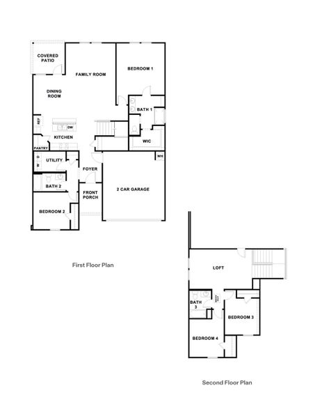 The first floor includes 2 bedrooms and 2 bathrooms. The primary bedroom is at the back of the home, off the family room, and includes an attached bathroom. This relaxing bathroom space features a 5’ walk in shower, double sink vanity, private toilet area with a door, and a walk-in closet. At the front of the home is a secondary bedroom, bathroom, and utility room. The secondary bathrooms include a tub/shower combination.